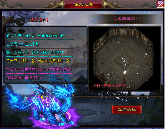 进入挑战需要1个挑战书,地图为个人副本,存在30分钟,BOSS未击杀,可重新进入。注:超过30分钟,无论BOSS是否击杀,副本都将销毁(大陆不同需要的挑战书不同)。